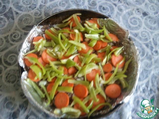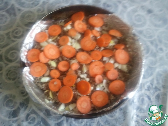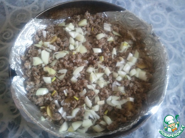 Покрыть говяжим фаршем. Я мясо пожарила на масле, потом добавила к картошке. Но можно и без этого положить свежее мясо.