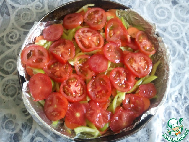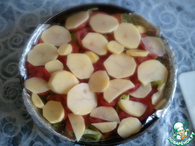 Нарезать мелко кольцами 4 картошки. Прдержать 10-15 мин в горячей воде (чтобы пропекалась), наложить на противень.