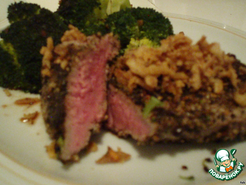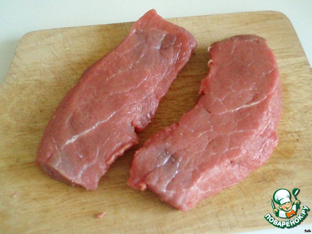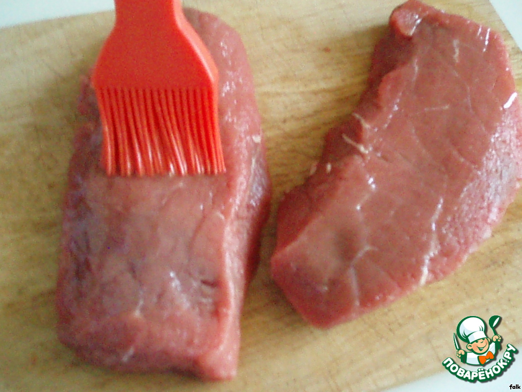 И еще пара советов. Мясо брать только охлажденное, не мороженное, перед готовкой оно должно быть комнатной температуры (вынуть из холодильника за пару часов). Если у вас большой кусок, резать порционно примерно с ладошку, не толще, чем 1.5 см и только ПОПЕРЕК волокон (если порежете вдоль, оно будет жесткое).