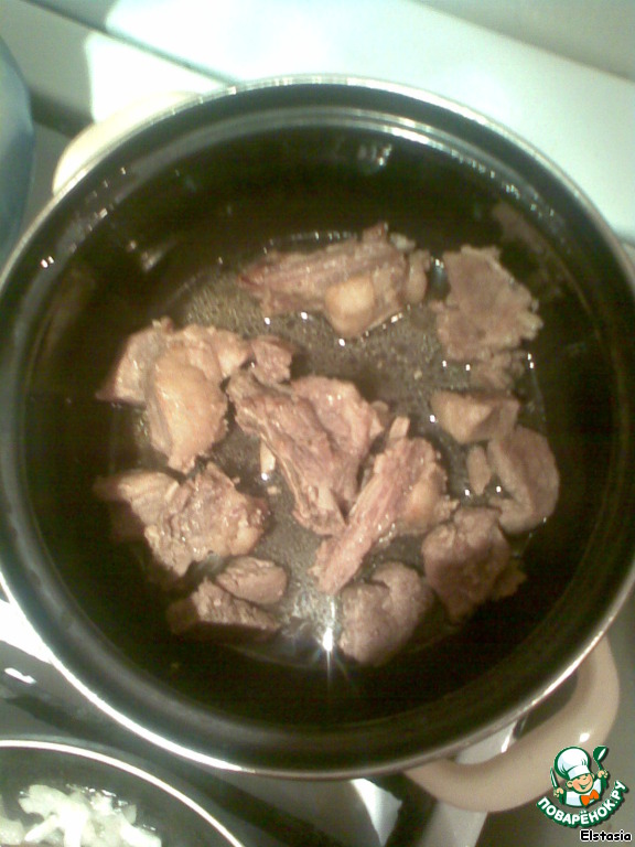 Обжариваем рёбрышки и телятинку (добавила телятину, чтобы можно было кормить и ребёночка) на сковороде на большом огне до золотистого цвета, присаливаем чуток для сока. Затем наливаем кипяченной воды и оставляем тушить на 15-20 мин. Я переложила мясо в кастрюльку, где оно у меня и тушилось на маленьком огоньке.