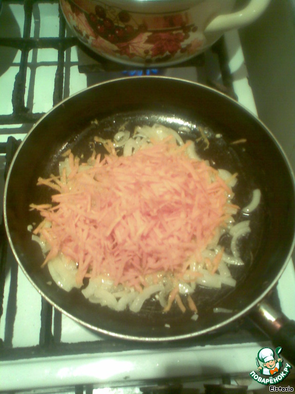 Тем временем делаем соус к мясу: лук режем как на за жарку (я люблю не кубиками, а четвертинкой кольца) и поджариваем на сковороде (там, где изначально жарили мясо) до золотистой корочки, затем трем морковь на крупную терку и добавляем к лучку.