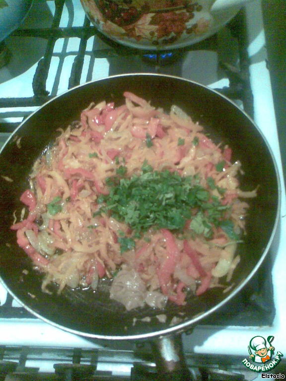 Теперь добавляем нарезанный соломкой болгарский перец и еще через минутку - мелко порезанную зелень и чайную ложку горчицы. Сразу же почувствуете пикантный аромат.