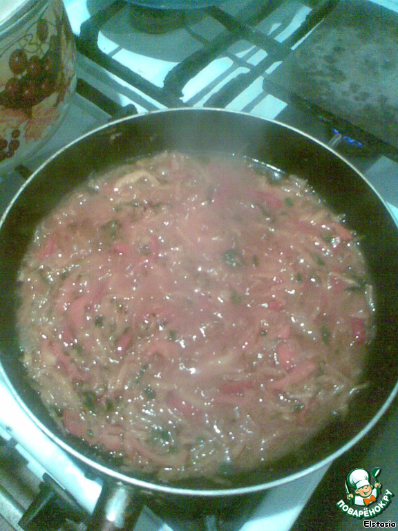 Немного все это протушив, добавляем ложку томата, сахар, соль и разбавляем всю эту красоту бульоном, в котором тушились наши рёбрышки! Еще минутку тушим.
