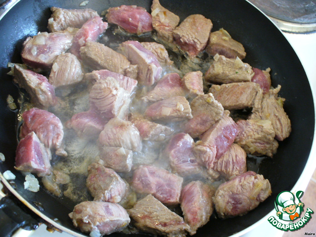 К луку добавить говядину, посолить, поперчить, добавить бульон и тушить 20-25 минут, пока бульон не выпарится.