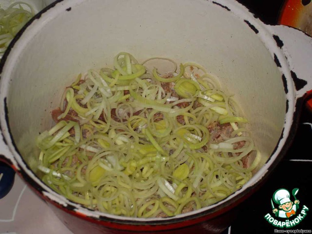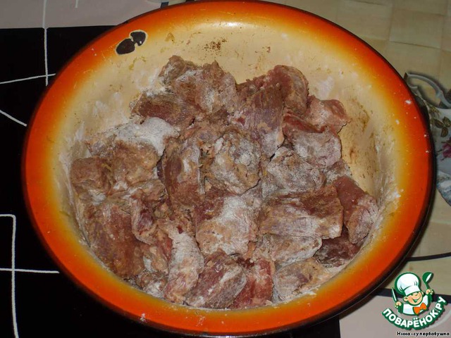 Половину мяса обвалять в муке и выложить в кастрюлю. Желательно с толстыми стенками.