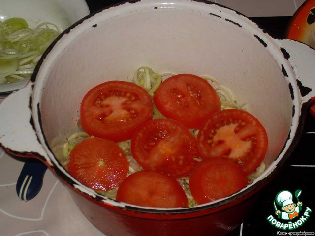 Закрыть кружками помидора. Затем слои повторить. Влить вино и воду, посолить, поперчить и поставить на огонь. Довести до кипения, огонь уменьшить и тушить на самом маленьком огне 50 минут под крышкой.