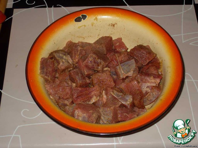 Мясо нарезать кусочками, как на гуляш, добавить горчицу и перемешать. Оставить на пару часов мариноваться.