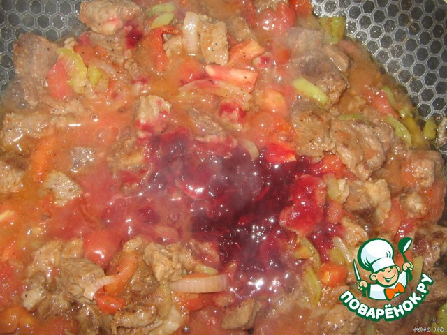 Добавляем ткемали и немного воды. У меня был домашний, который делают в Абхазии. Их очень много видов, этот был не из зелёных, а из фиолетовых слив.