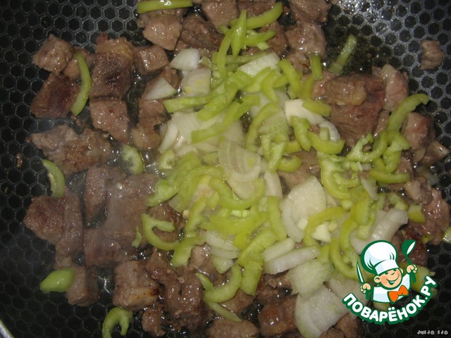 Нарезаем лук и перец соломкой. Добавляем к говядине.