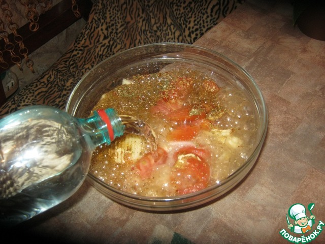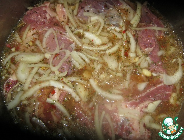 В "кипящую"от пузырьков воды смесьдобавляю мясо и оставляю мариноваться на несколько часов