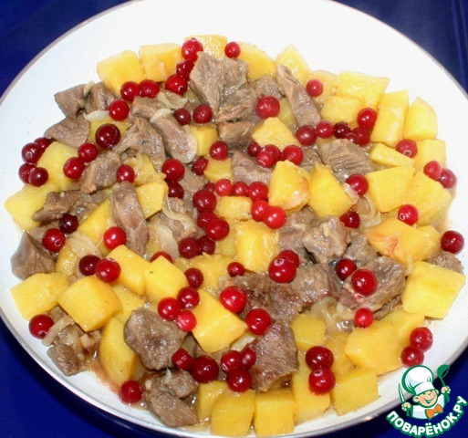 | Мясо прекрасно сочетается с кисло-сладким вкусом. Вкусное, сочное жаркое из говядины и тыквы с клюквой - сочетание мяса и кисло-сладкого вкуса, тыква внесет в блюдо сладость, а клюква-кислинку. |