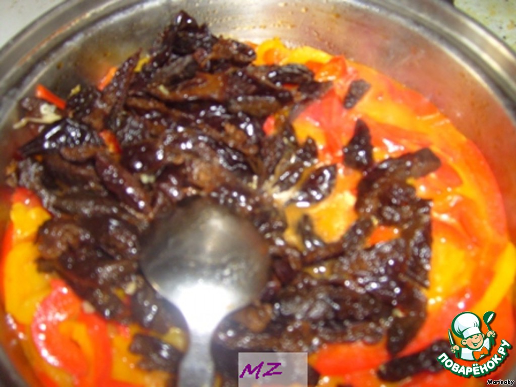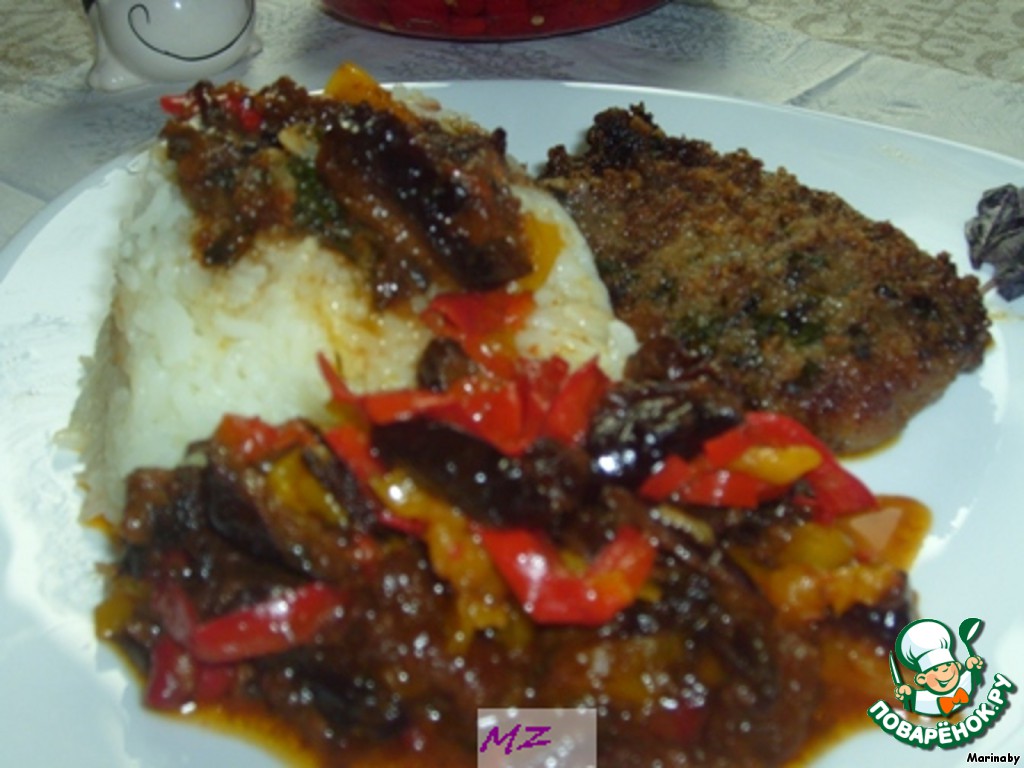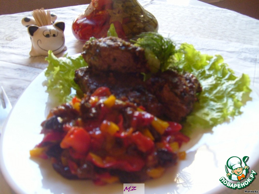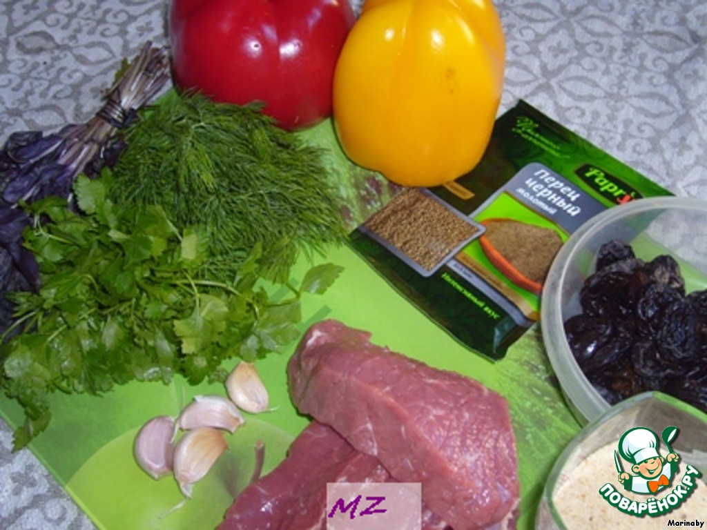 Перед подачей на стол выложить ростбиф на блюдо. На гарнир подать тушеный перец с черносливом.