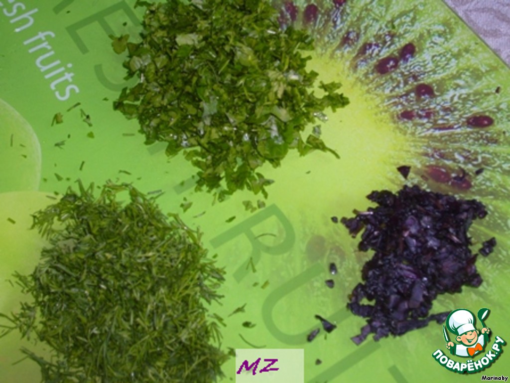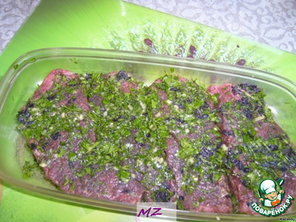 Чеснок раздавить прессом, смешать с солью, мелко порезанной зеленью и добавить ложечку оливкового масла. Мясо посыпать черным молотым перцем, натереть приготовленной смесью и оставить мариноваться на один час.