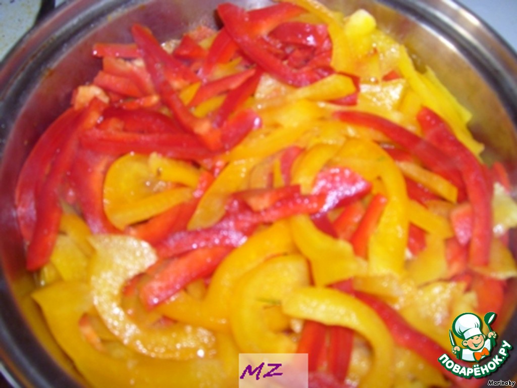 Пока маринуется мясо делаем гарнир. Перец нарезать полосками.
