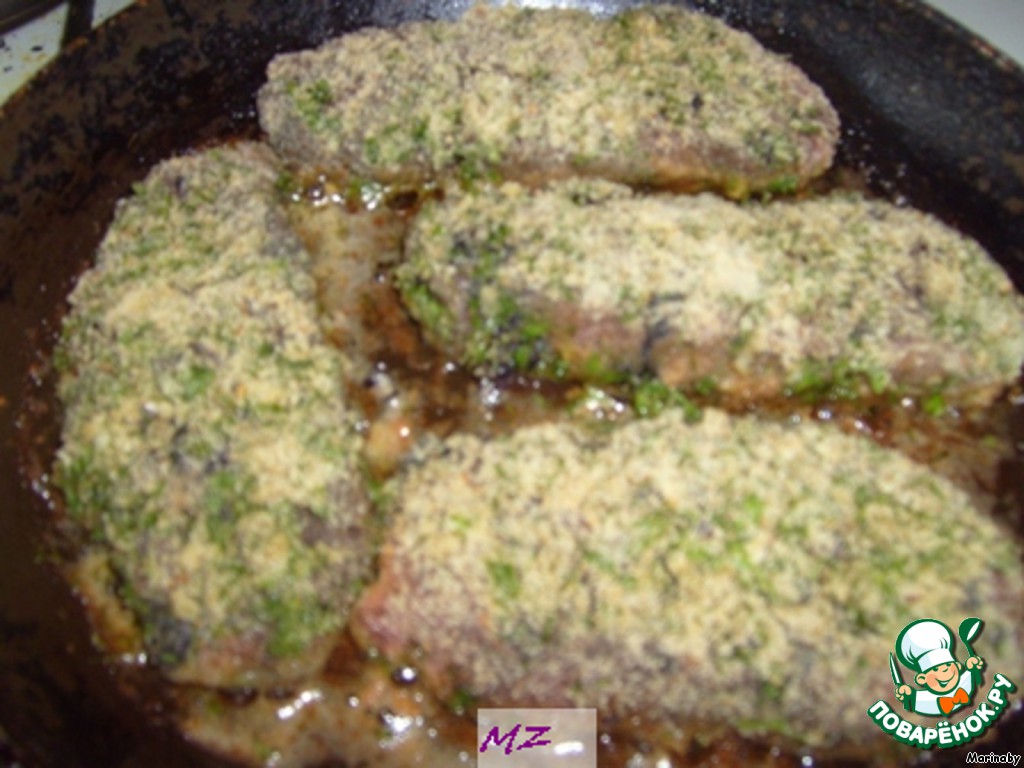 После мариновки обвалять мясо в панировочной смеси. Поджарить с обеих сторон на сливочном масле до готовности.