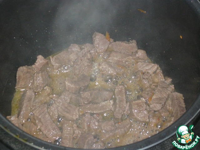 Мясо порезать небольшими кусочками, обжарить в чаше мультиварки на масле минут 10, периодически помешивая.