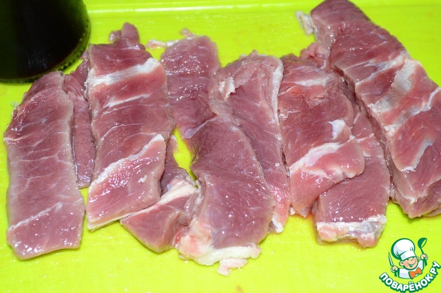 Мясо нарезать тонкими пластинками.