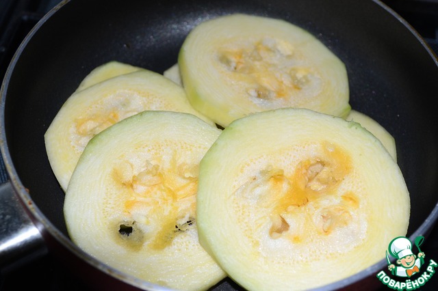 Кабачок очистить от кожуры и нарезать кружками. Сковороду с подсолнечным маслом разогреть и выложить в нее кабачок.