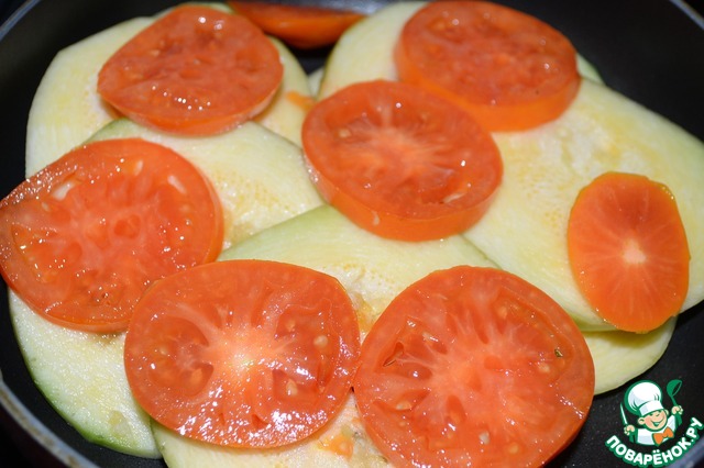 На кабачок выложить помидор, нарезанный кружком. Перец болгарский нарезать соломкой.