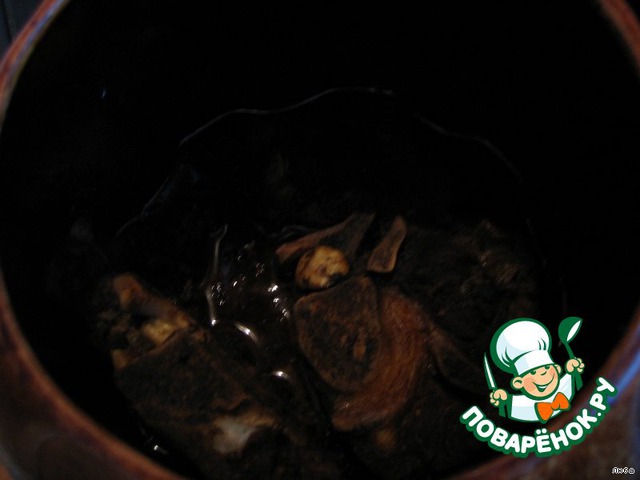 Затем перекладываем в казан или кастрюлю что бы можно поставить в духовку (у меня глиняный горшок), кладем половину ребрышек на них лук, затем опять ребрышки. Заливаем маринадом, что остался, и в духовку на час 180 *, и на 40 мин 100 *.