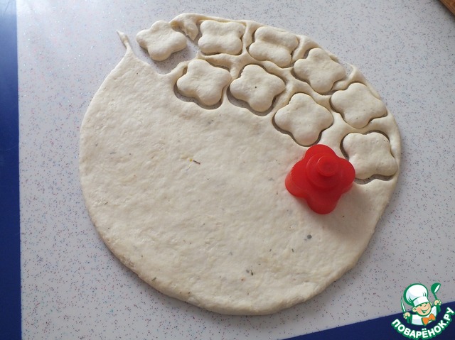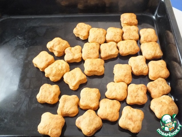 Пока мясо обжаривается, раскатаем тесто в пласт толщиной 1 см и вырежем фигуры произвольной формы. Выпекаем в духовке минут 20