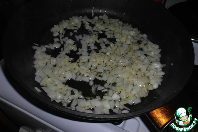 3. Измельчаем лук и поджариваем его на оливковом масле в большой сковороде с толстым дном до мягкости, примерно 5 минут.