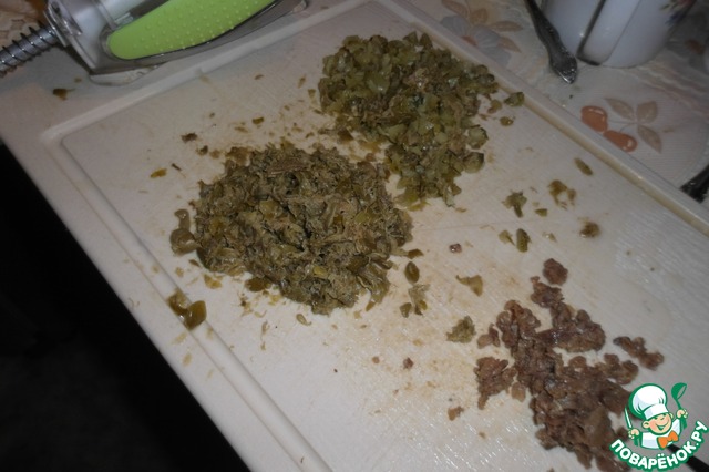 7. Мелко порубить корнишоны, каперсы, анчоусы. Все перемешать.