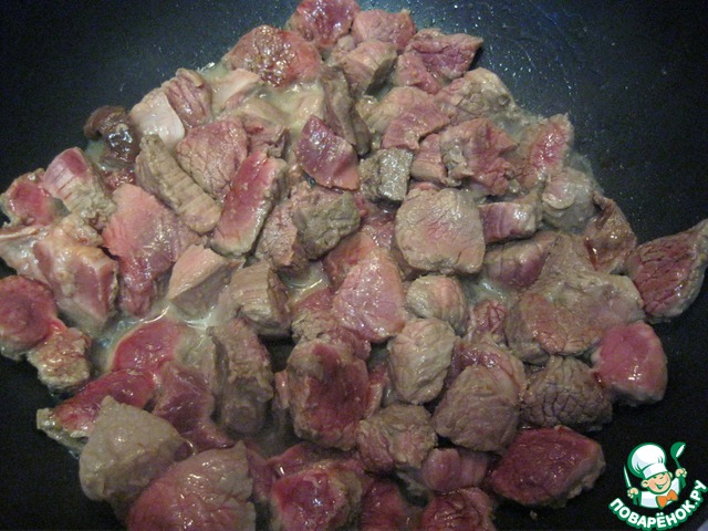 Говядину нарезать кусочками и обжарить в масле до румяной корочки. Как только мясо подрумянится, подлить немного воды и тушить на медленном огне до готовности (около 1,5 часов).
