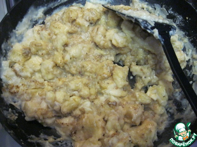 Далее в мук добавить молоко и тчательно растереть комочки. Туда же положить кусочки банана. Соус прокипятить на очень медленном огне 2-3 минуты, влить в мясо и прокипятить еще 2-3 минуты.