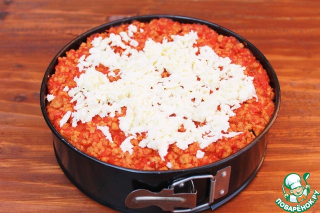 Достаньте торт из духовки. Посыпьте натертым сыром моцарелла и верните в духовку. Выпекайте, до золотистого цвета от 10 до 15 минут не больше.