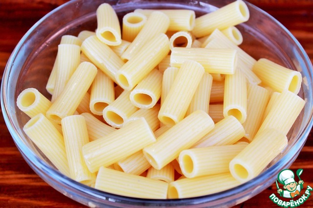Возьмите большую кастрюлю с водой доведите до кипения. Добавьте соль, макароны и варите до полу готовности.