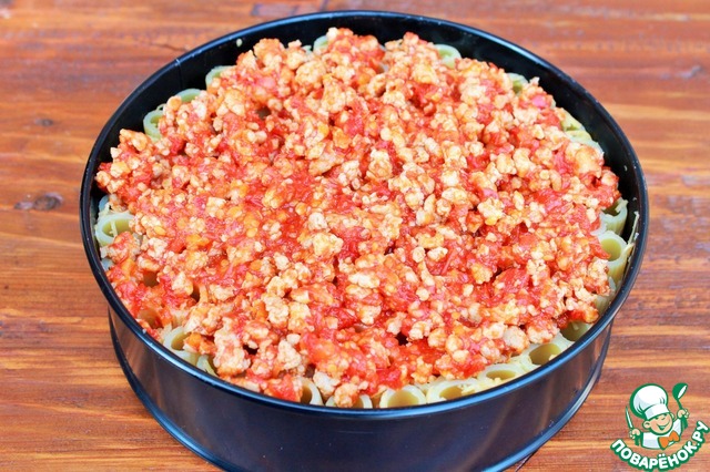 Положите 2 стакана мясного соуса поверх макарон, протолкните мясо в отверстия макарон. Оставшийся соус выложите поверх макарон. Выпекайте 15 минут.
