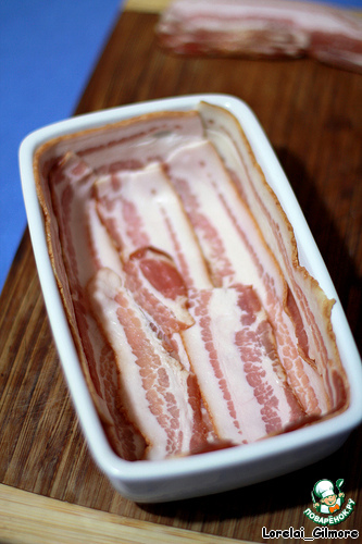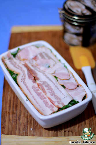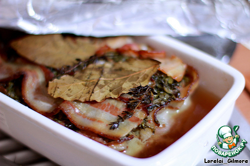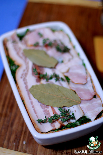 Так можно процедуру проделать 5-6 раз (все зависит от высоты формы), выкладываем сверху лавровый лист и пару веточек тимьяна, вливаем вино.