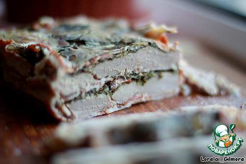 | Рулет-террин, полосатый рисунок на срезе, технология приготовления взята из книги Хорошая Кухня/Рулеты, Террины, Галантины. |