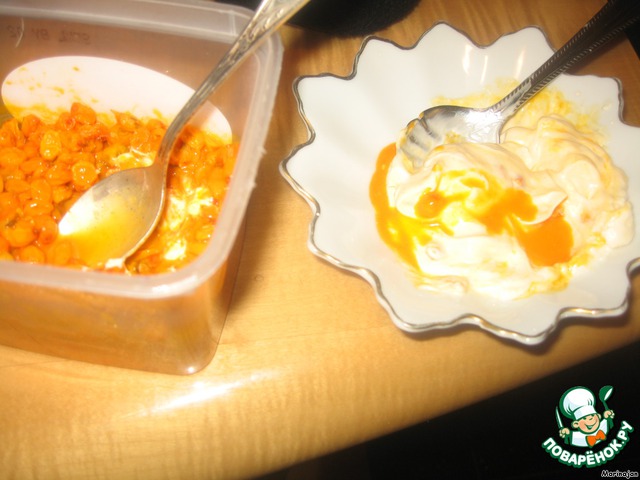 Для подливки использовала соус из взбитых сливок с соком облепихи.
