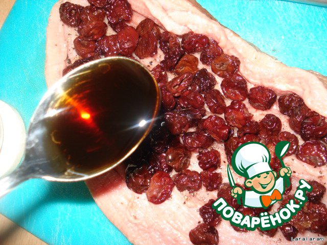 На мясе делаем надрезы по всей длине филе так, чтобы его можно было как-бы развернуть, ну прям раскатать (как красную дорожку для -персон), внутри и снаружи натираем гранатовым сиропом, крупной солью (я брала ещё ту, "совковую") и крупно молотым чёрным перцем. Внутрь кладём вишни, и мяско завернуть рулетиком. Если будет "взад" разворачиваться, то скрепите его зубочистками, я понимаю, что это не комильфо - но какой выход?