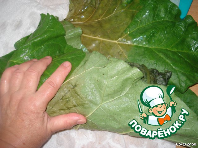 Листья расправить на столе, положив их внахлёст - у меня мясо было сначала завёрнуто в хреновые листья, затем девясил и уж потом ревень...