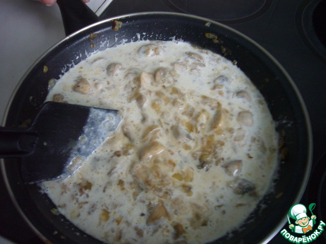 Через 5-7 минут добавить стакан сливок ( я пользовалась 10%-ми), тимьян (сухого - пару щепоток, свежего - мелко порезанные листочки с одной веточки) и довести соус до кипения.
