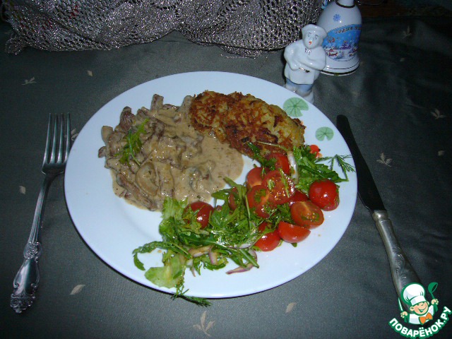 У меня мясо подано с картофельными оладьями, помидорами черри и салатом руккола.