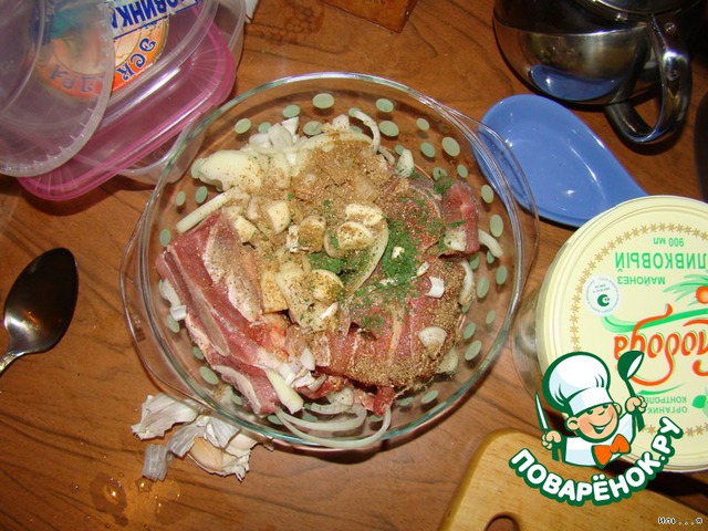Выкладываем в посуду для маринада, добавляем лук, нарезанный полукольцами, чеснок (каждый зубчик разрезать пополам), специи