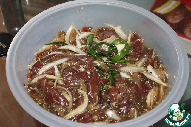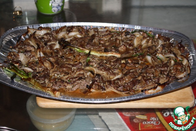 | Пулькоги — одно из самых распространённых блюд в Корее. Корейцы готовят его дома, в кафе и ресторанах. «Пулькоги» в переводе с корейского — «огненное мясо», так что название блюда происходит буквально от его способа приготовления — на открытом огне. Есть варианты пулькоги из говядины и даже из курицы. Пулькоги может готовиться в сковороде, хотя обычно жарится на гриле. Головки чеснока, резанный перец и лук часто жарятся вместе с мясом. Это мой первый рецепт, прошу не сильно закидывать камнями :) Если у вас появятся вопросы, с удовольствием отвечу, только мой часовой пояс +7 по МСК :) |