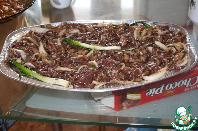 Смазать фольгу кунжутным маслом и выложить наше мясо. У нас в городе продают алюминиевые подносы, поэтому в моем случае был поднос :)