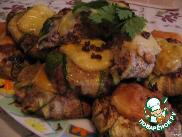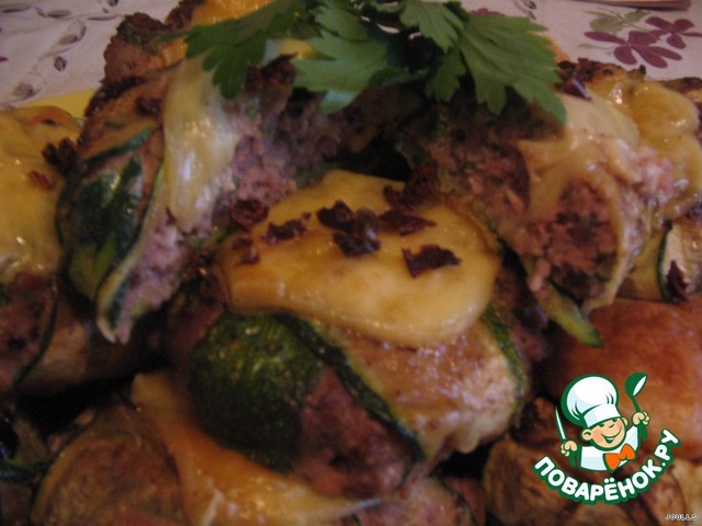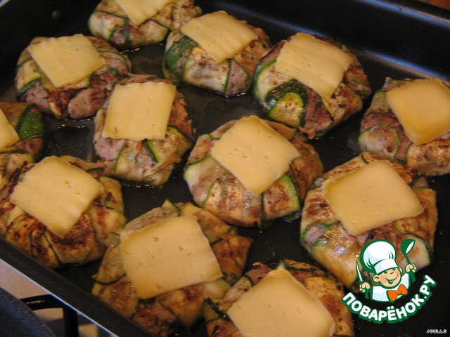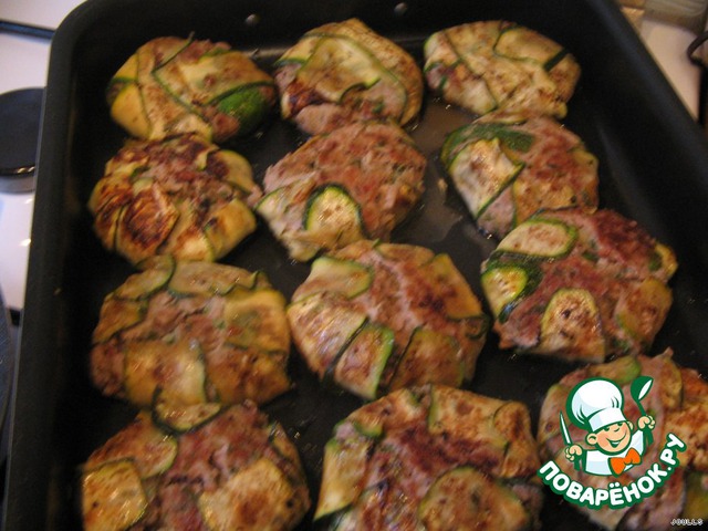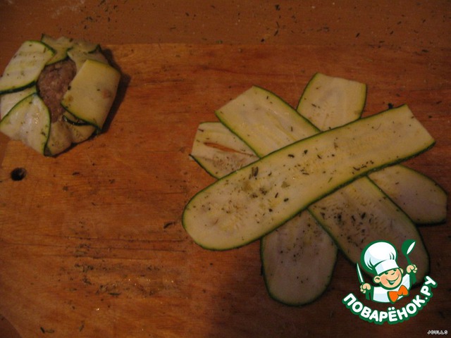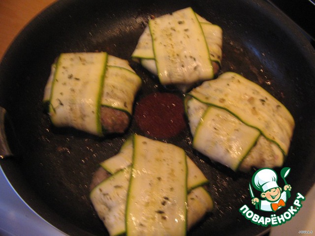 Из фарша сформировать бургеры и обернуть их ломтиками цуккини.