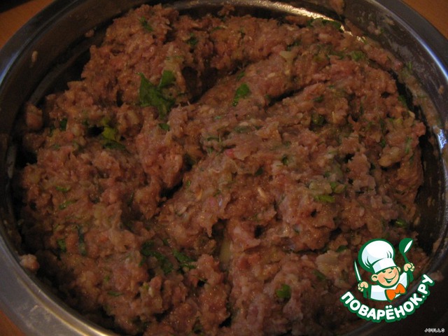 Мякоть говядины, копченую грудинку с луком и чесноком дважды пропустить через мясорубку, добавить 1 яйцо, специи, соль и хорошо перемешать.