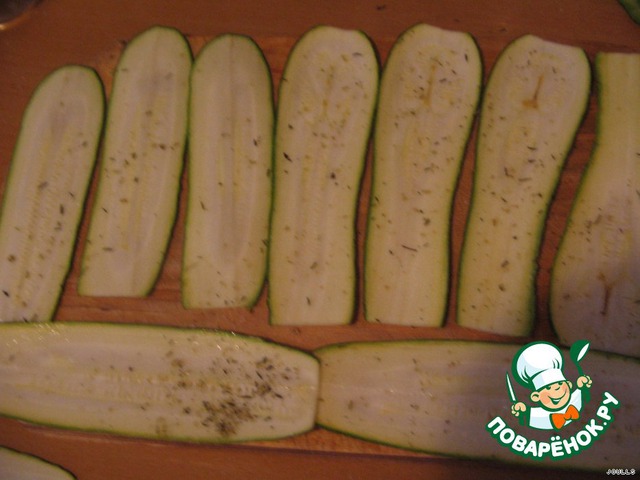 Цуккини нарезать тонкими длинными ломтиками при помощи чистилки для картошки, специальной терки или очень острого ножа с длинным лезвием. Посолить, посыпать специями (н-р для овощей гриль)