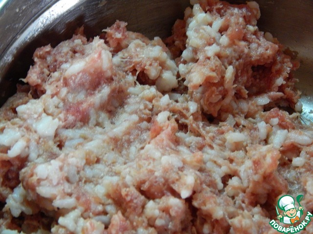 Отваренный заранее рис смешиваем с приготовленным фаршем, добавляем специи.