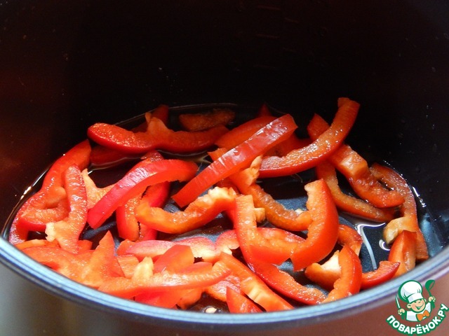 Долму готовим в мультиварке. На дно мультиварки выливаем оливковое масло, выкладываем перец, слегка обжариваем минуты 3.