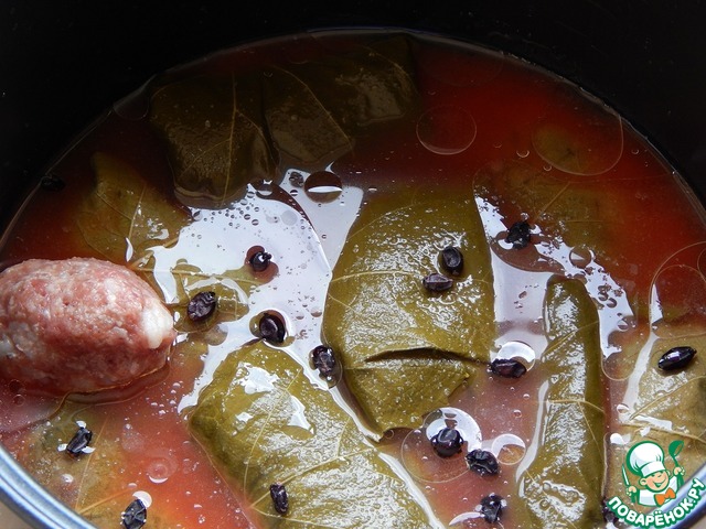 Выкладываем долму на перец, заливаем томатным соком и включаем режим Тушение. Тушим 100 минут.