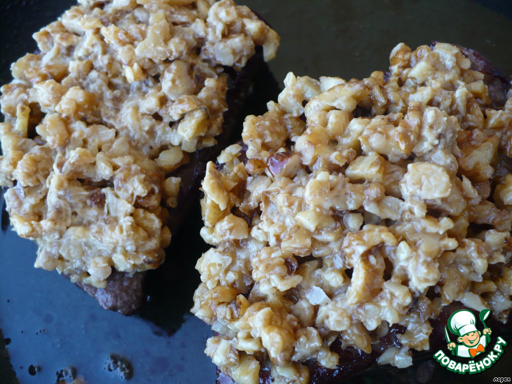 Поставить мясо в разогретую до 200 градусов духовку и довести до готовности. Я запекала мясо еще 10 минут, прикрыв орехи фольгой, чтобы не сгорели