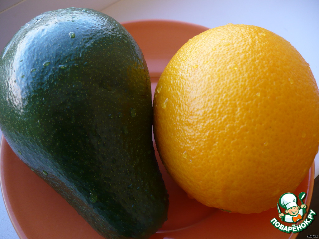 Половину авокадо очистить, нарезать кусочками, добавить сок из половины апельсина, посолить и измельчить в блендере до пюреобразного состояния